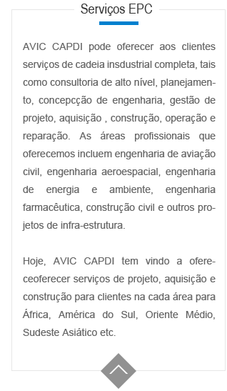 AVIC CAPDI pode ofereceoferecer os servi?os tais como engenharia, projecto arquitectótico, constru??o, protec??o ambientais e consultoria para áreas diferentes de clientes. Sempre ofereceoferecemos aos clientes com solu??o única, inovadora, custo baixo e eficiente. De avia??o civil e da avia??o geral, defesa nacional e bases militares para energia e estruturas ambientais, edifícios civis, instala??es industriais, edifícios farmacêuticos, AVIC CAPDI tudo pode ofereceoferecer os servi?os de planejamento profissional, projeto e constru??o, a fim de ultrapassar consistentemente as expectativas de nossos clientes.