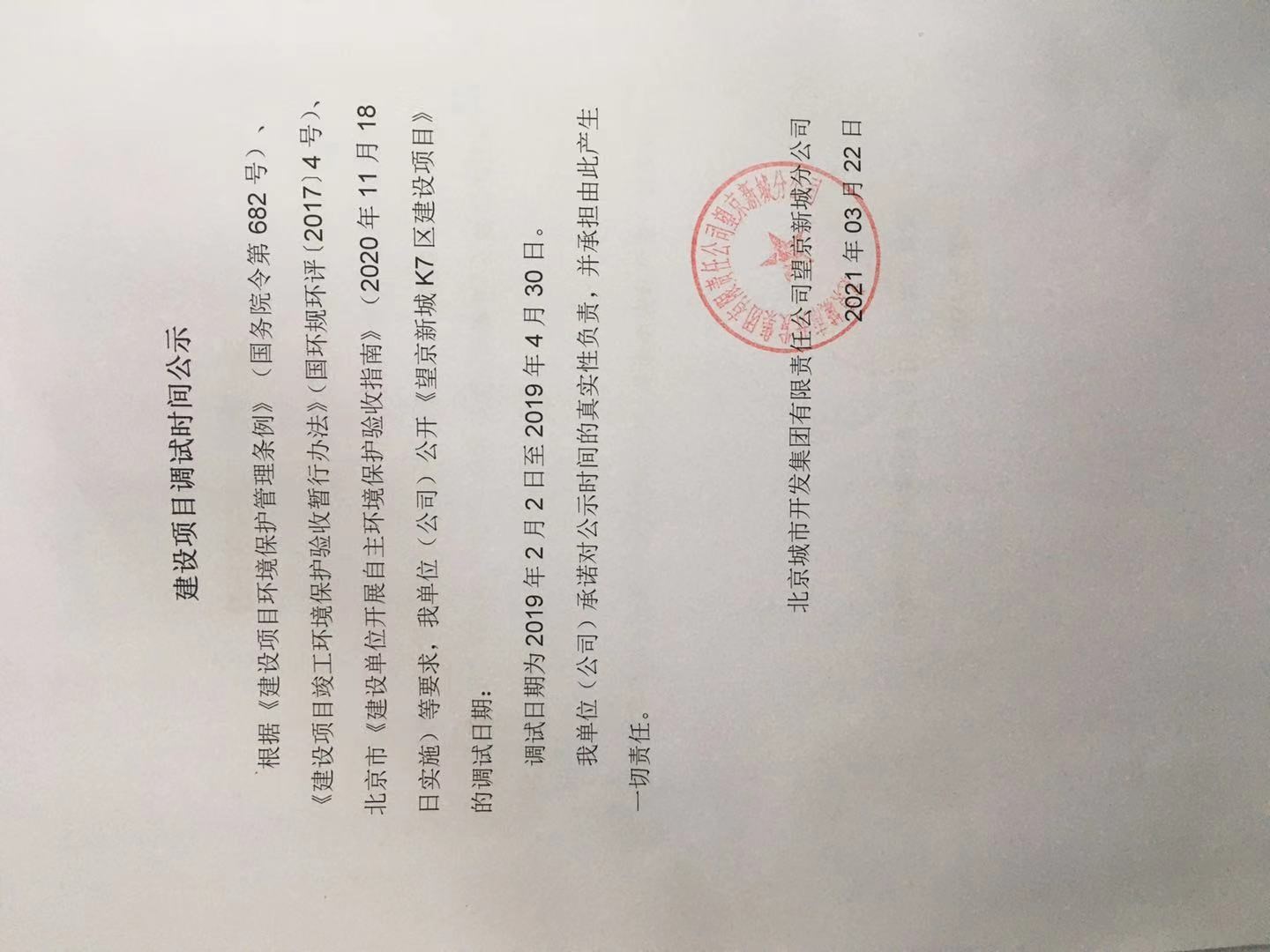 關(guān)于北京城市開發(fā)集團(tuán)有限責(zé)任公司望京新城分公司《望京新城K7區(qū)建設(shè)項(xiàng)目》調(diào)試時(shí)間的公示